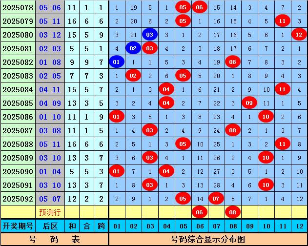 后隔离析:在第093期历史同时开奖中,和值大小为10:8,跨度奇偶比为8:10,本期后区提防两码06和08。